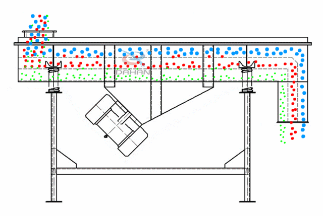原理是利用振動電機激振器作為振動源,使物料在篩網上被拋起,同時向前作直線運動,物料從給料機均勻地進入篩分機的進料口,通過多層篩網產生數種規格的篩上物、篩下物、分別從各自的出口排出。