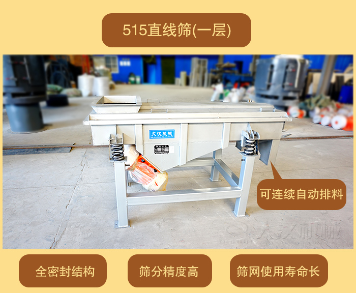 DZSF-515直線篩(寬)500mm×1500mm(長),體積小移動方便,價格便宜。大漢直線振動篩廠家可為客戶量身定做特殊要求的直線振動篩(單層或多層)。515直線振動篩按材質分為304不銹鋼材質和碳鋼材質。