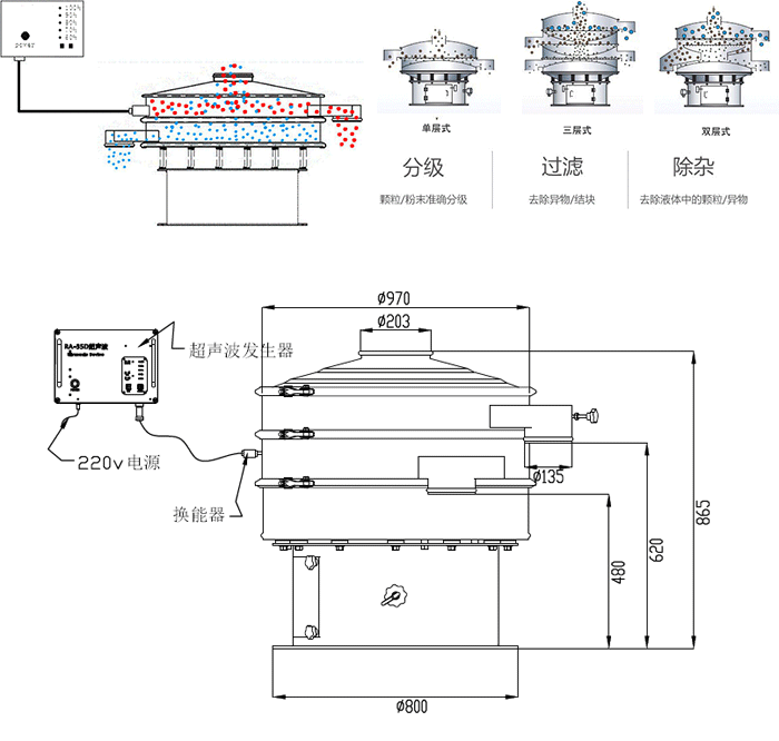 超聲波振動篩是在原有的電機帶動振動篩振動的基礎上,增加了超聲波系統。振動篩堵網的問題是制約篩分效率的關鍵,堵網問題解決了,其他問題就迎刃而解.超聲波裝置是由超聲波電源通過換能器將超聲波轉換為每秒37000次的高頻機械波作用于篩網表面。來起到清理篩網的作用。解決了由于篩孔上的靜電附著力,粉末的凝聚作用和插入粗糙網絲表面的微粒而造成的堵塞問題。提高了篩分效率。